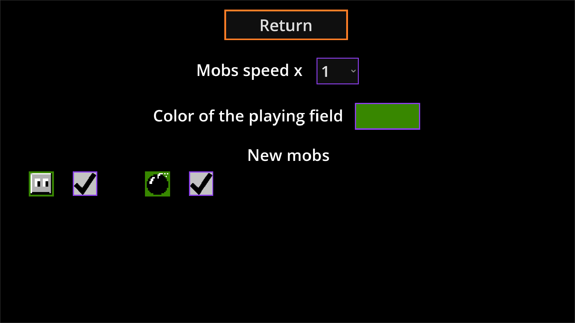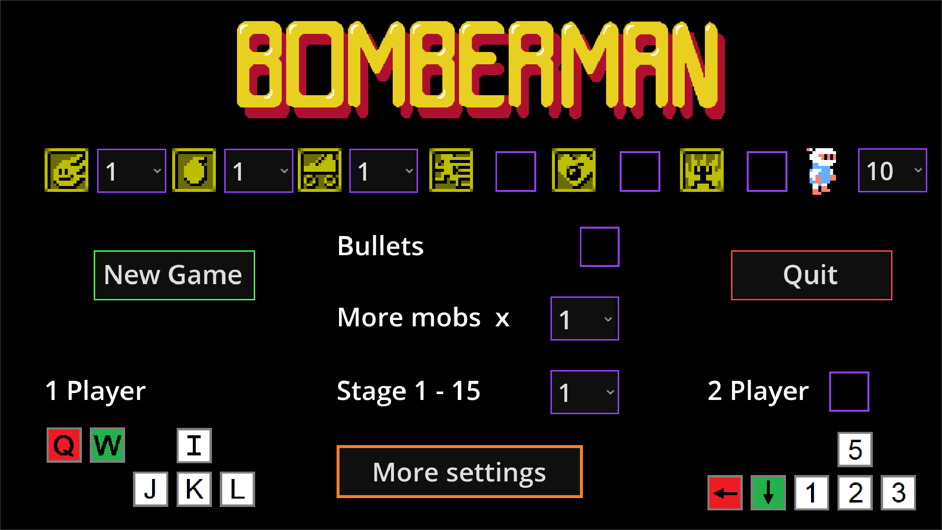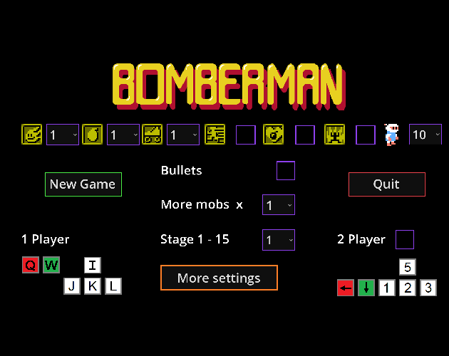 Classic Bomberman game with new mobs and starting settings. At the game’s start, you can choose the number of mobs, enable new mobs not in the original game, allow mobs to shoot bullets, and change the color of the game field. You can also play with two players!